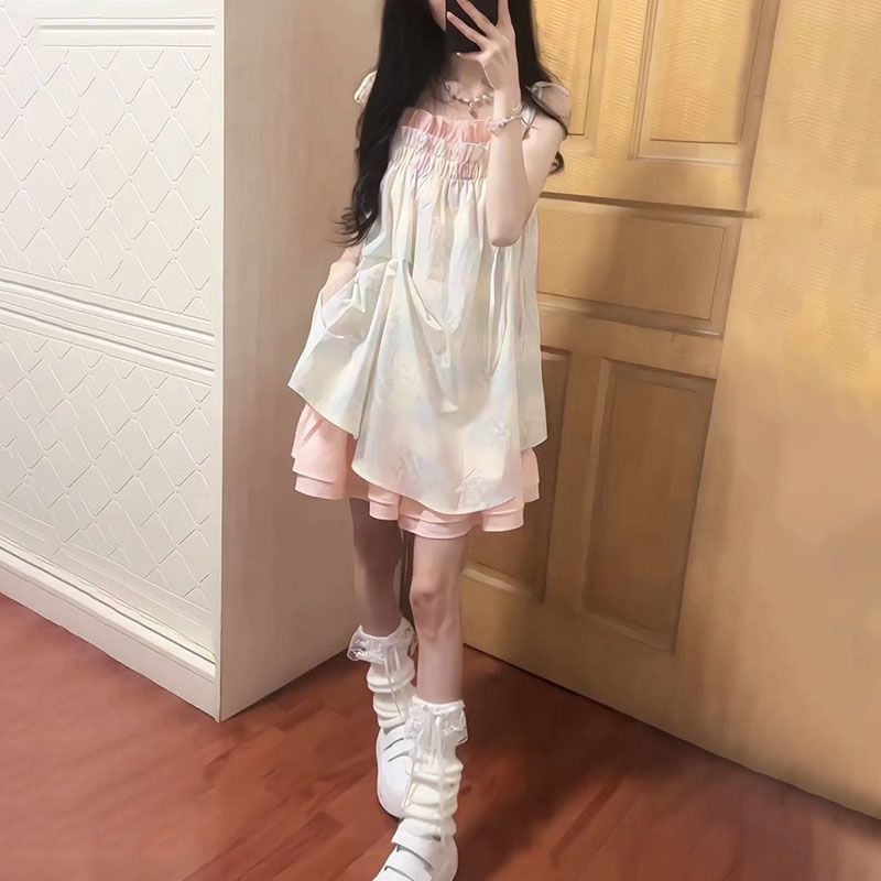 Gaun Sling musim panas baru 2022 rok kecil ramping pelajar Super peri longgar gaya Korea bunga kecil