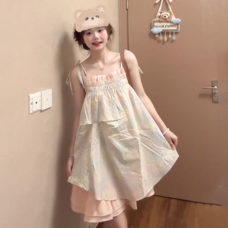 Gaun Retro Musim Panas 2025 Rok Pendek Tali Segar Kecil Rok Bunga Kecil Tubuh Kecil Rok Terlihat Langsing Membentuk Tubuh Murid