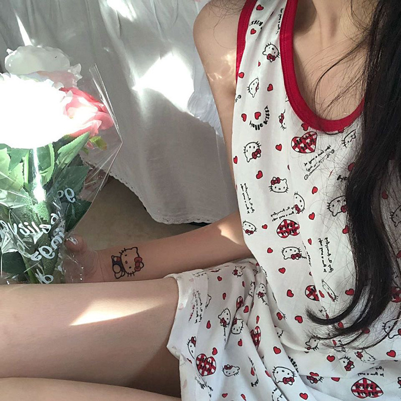 Gaun malam tanpa lengan Hello Kitty anak perempuan, rok tipis manis, pakaian rumah longgar, tanpa lengan, Hello Kitty, lucu, Jepang
