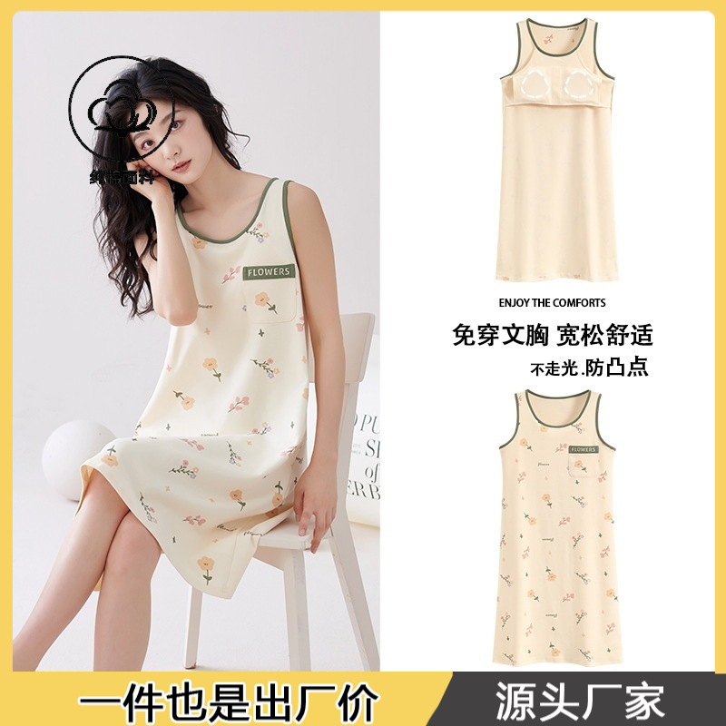 Gaun malam tanpa lengan untuk wanita, pakaian rumah tipis rompi katun longgar pelajar perempuan manis dengan bantalan dada musim panas untuk wanita
