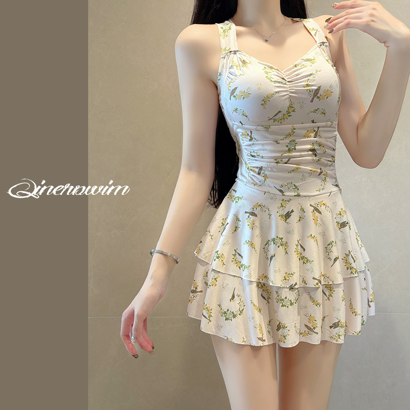 2025新款连体泳衣女夏性感碎花蛋糕裙保守遮肚显瘦挂脖泡温泉学生