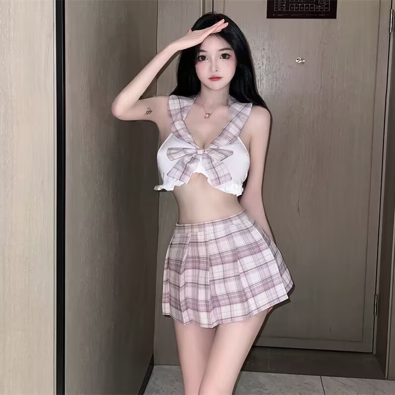 Baju dalam seksi kotak-kotak, baju seragam pelajar wanita, pakaian siswa kotak-kotak, ukuran plus 11 ganda, 2282