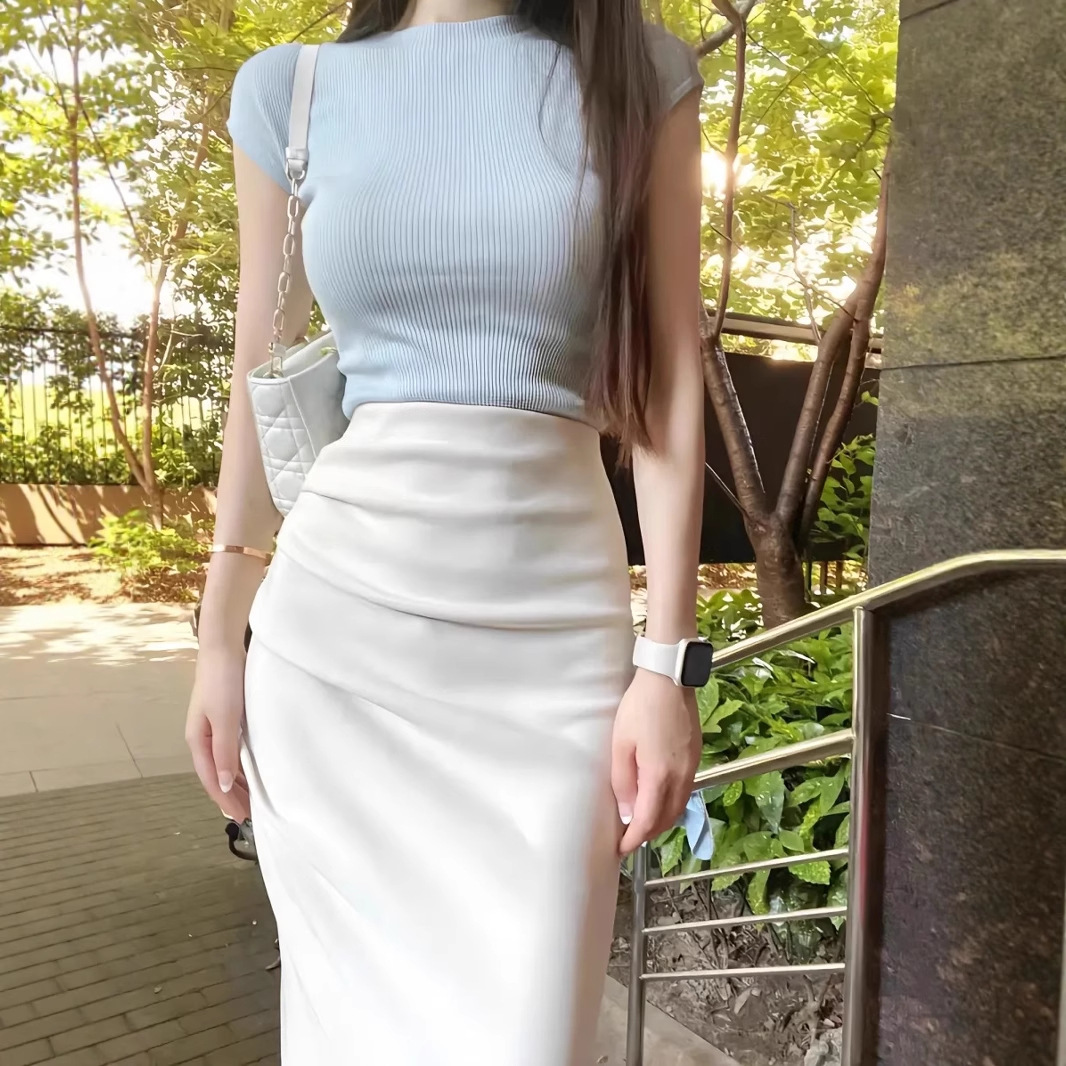 Kaus Lengan Pendek Warna Biru Dipakai untuk Dipakai Kakak Perempuan Kecil Musim Panas Rok Setengah Badan Menutupi Pinggul Usia Mengurangi Usia Gaya Barat Pakaian Dua Set Wanita