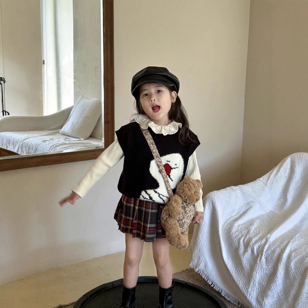Set pakaian tiga potong untuk perempuan, rompi wol kartun bebek + kemeja bottoming kerah daun bunga + rok kotak-kotak JK
