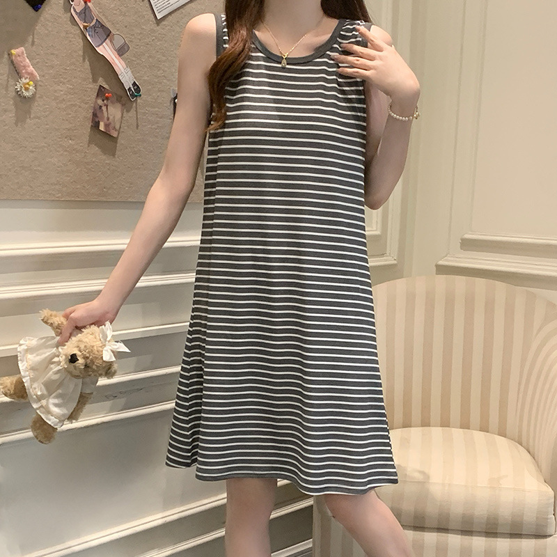 Rompi Bergaris Versi Korea Rok Tidur Wanita Musim Panas Leher Bulat Tanpa Lengan Rok Setengah Panjang Kasual Model Tipis Rok Rumah Siswa Bisa Dipakai di Luar
