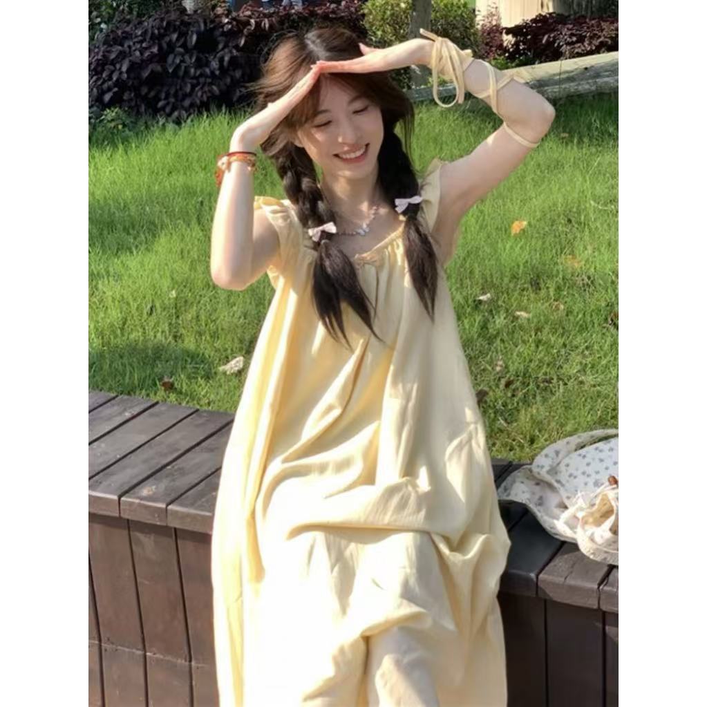 Gaun Peri Cantik Manis dan Lembut Gaya Liburan Rok Panjang Sedang Wanita Warna Kuning Longgar Murid Desain Lengan Terbang Kecil Gaya Liburan
