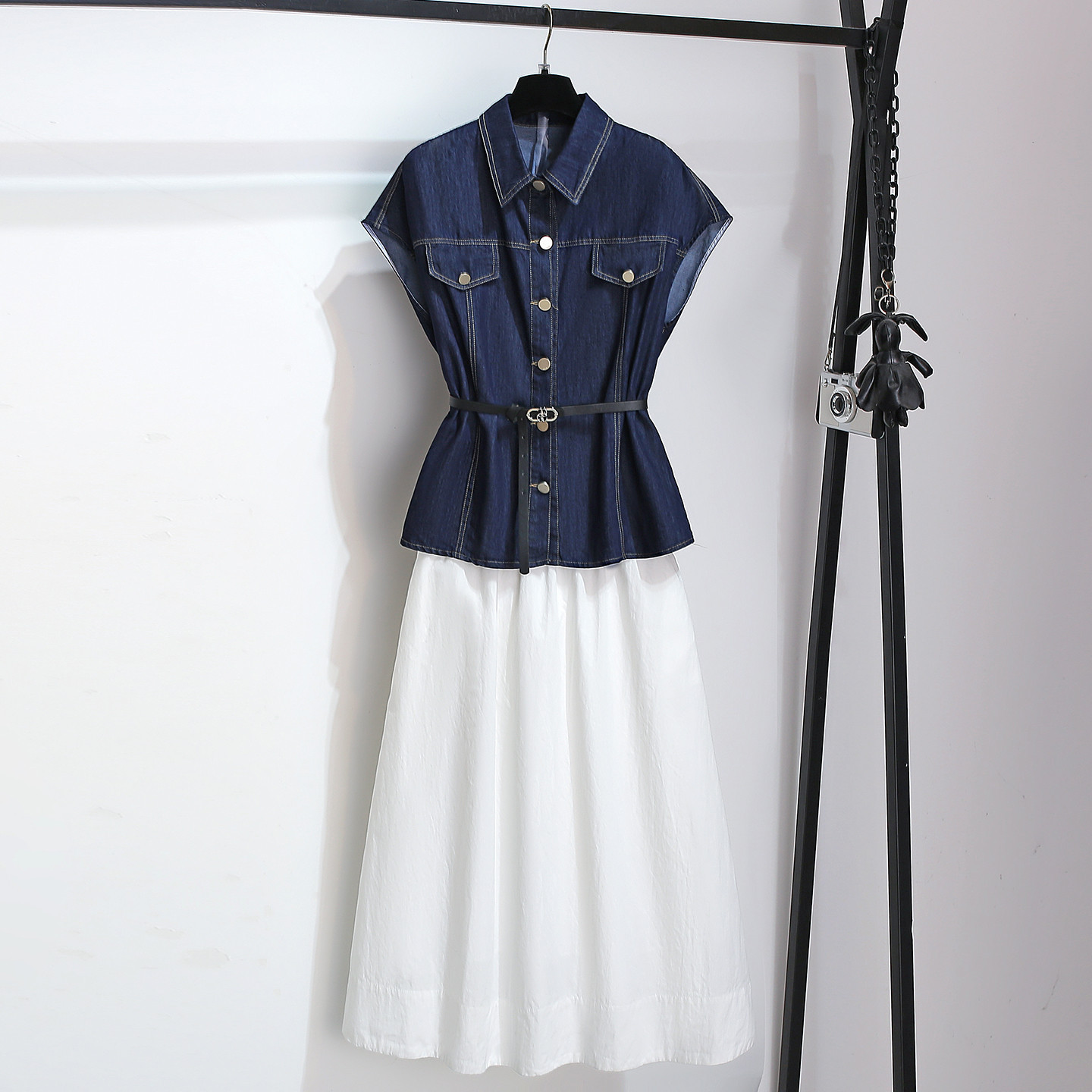 Kemeja Denim Ketat Pinggang Tanpa Lengan Rok Setengah Badan Warna Putih Setelan Dua Potong Gaun Sentuhan Kelas Tinggi Model Baru Musim Panas 2025 Wanita