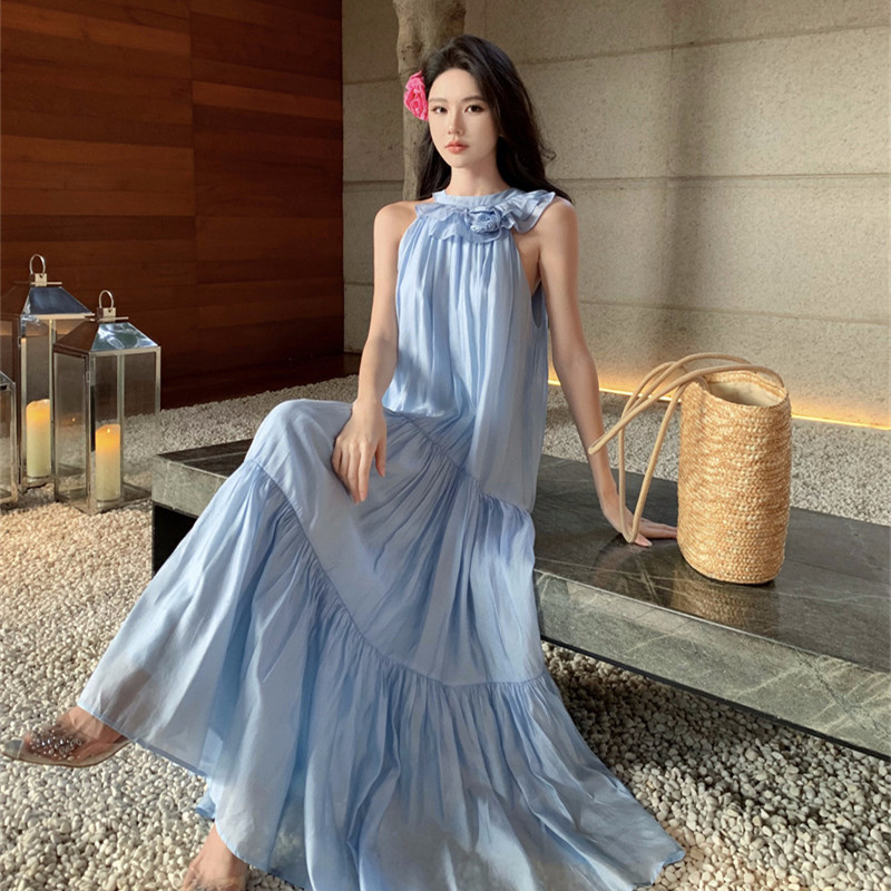 Gaun halter benang ringan biru lembut bergerak peri gaun pantai liburan bunga baru musim panas 2024