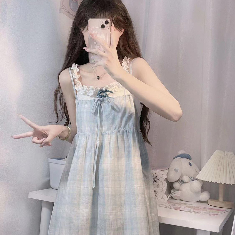 Gaun kotak-kotak gadis garam kasual rok suspender elegan musim panas dua potong palsu rok a-line manis pelajar wanita