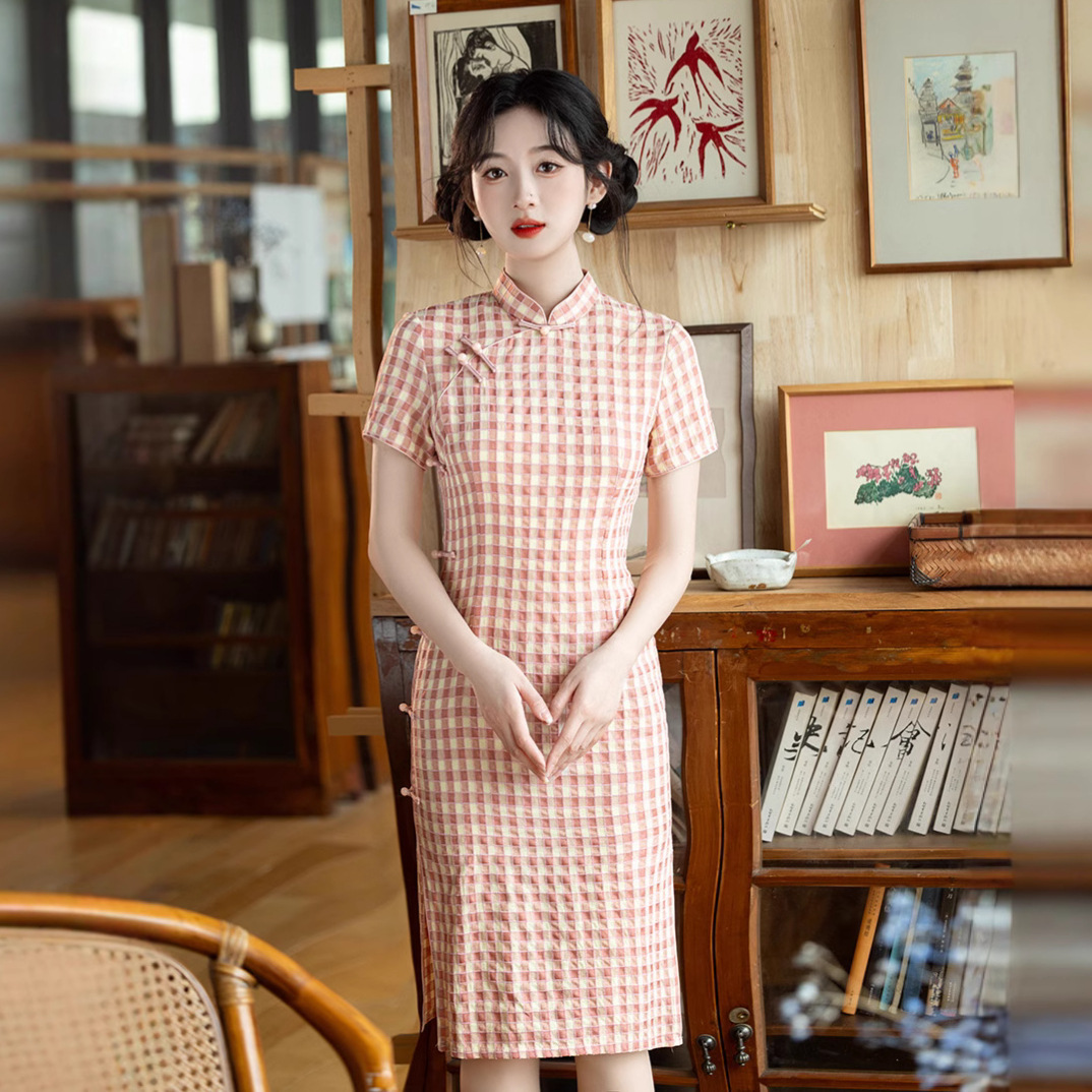 Tang Yilian Cheongsam Gaya Tiongkok Baru Kotak-Kotak Kecil Merah Muda 2025 Model Baru Siswa Musim Panas Republik Tiongkok