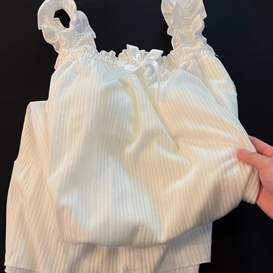 Piyama katun buatan gaya Korea musim panas, piyama tali pita lucu untuk wanita, gadis pelajar putri, bantalan dada sabuk angin