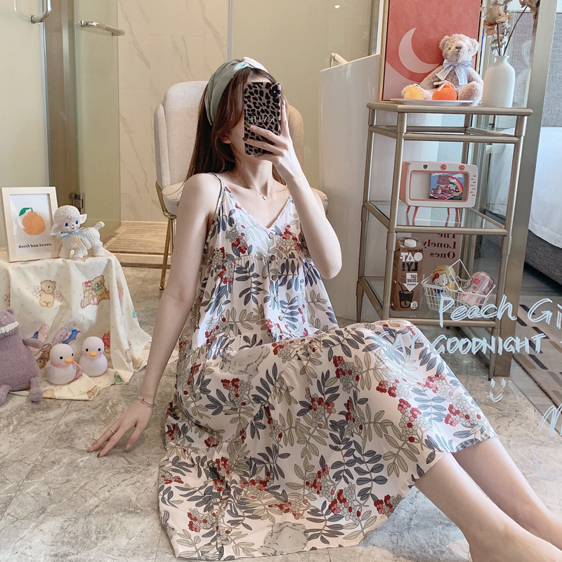 Gaun malam seksi wanita, baju tidur baru musim panas, baju suspender seksi, baju katun buatan sutra bermotif, pakaian rumah pelajar longgar, tipis lintas batas