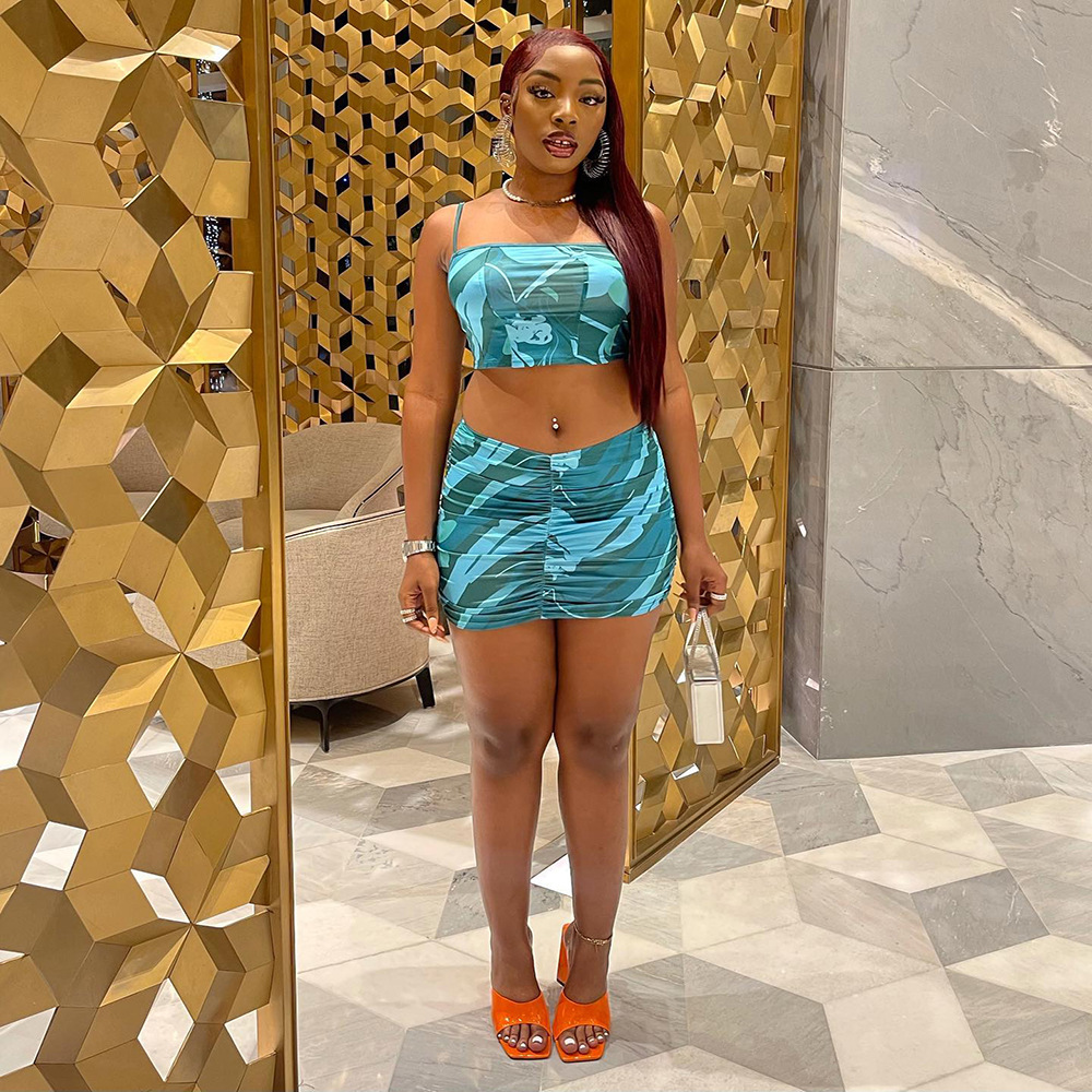 Setelan rok berlipat bermotif tali tanpa lengan hipster jalanan pakaian wanita lintas batas Amazon AliExpress dua potong Eropa dan Amerika