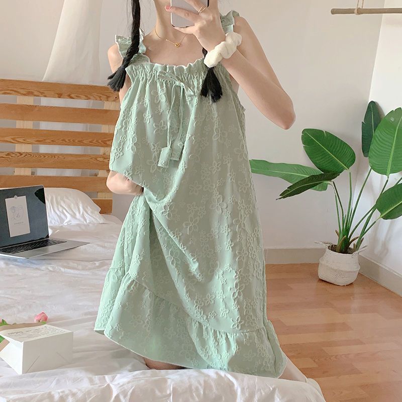 Gaun malam wanita, piyama pakaian rumah murid perempuan manis satu potong gaya ins musim panas setengah panjang