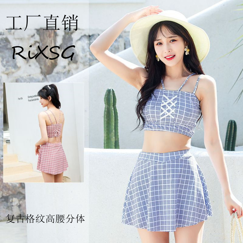 Baju renang wanita konservatif, Rok terpisah kotak-kotak kecil dua potong baju renang murid perempuan musim semi panas tepi pantai grosir