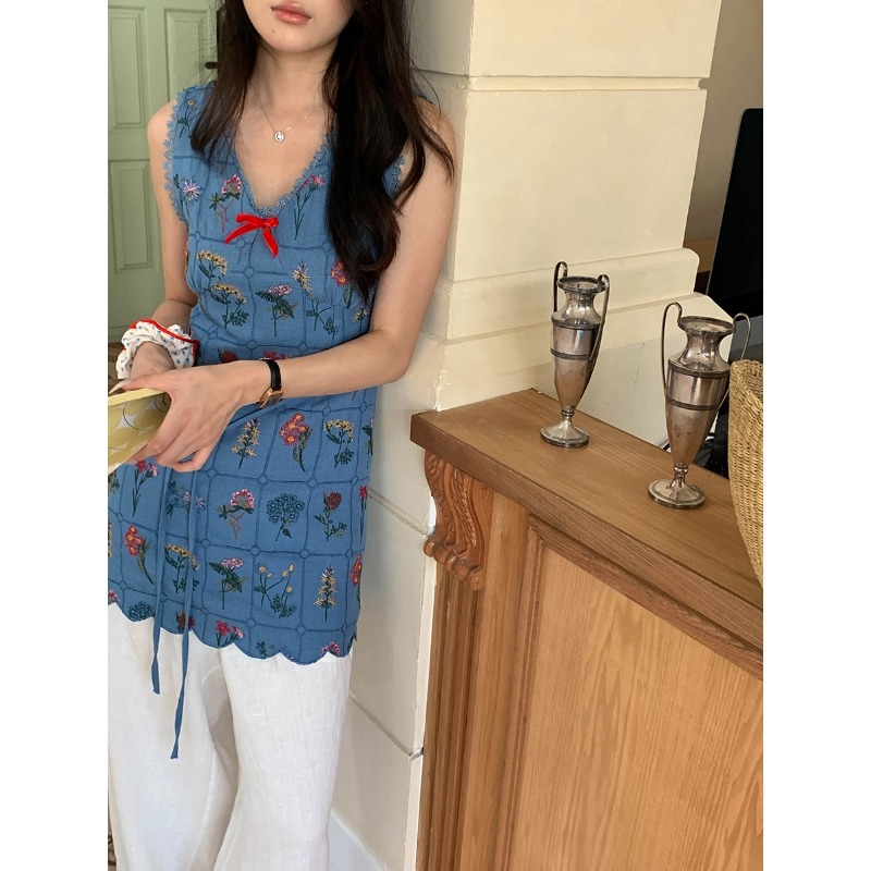 Gaun Rompi Bordir Renda Rok Rompi Tanpa Lengan Model Sedang Panjang Sambungan Gaya Liburan Model Baru Musim Panas 2025 Wanita Trendi