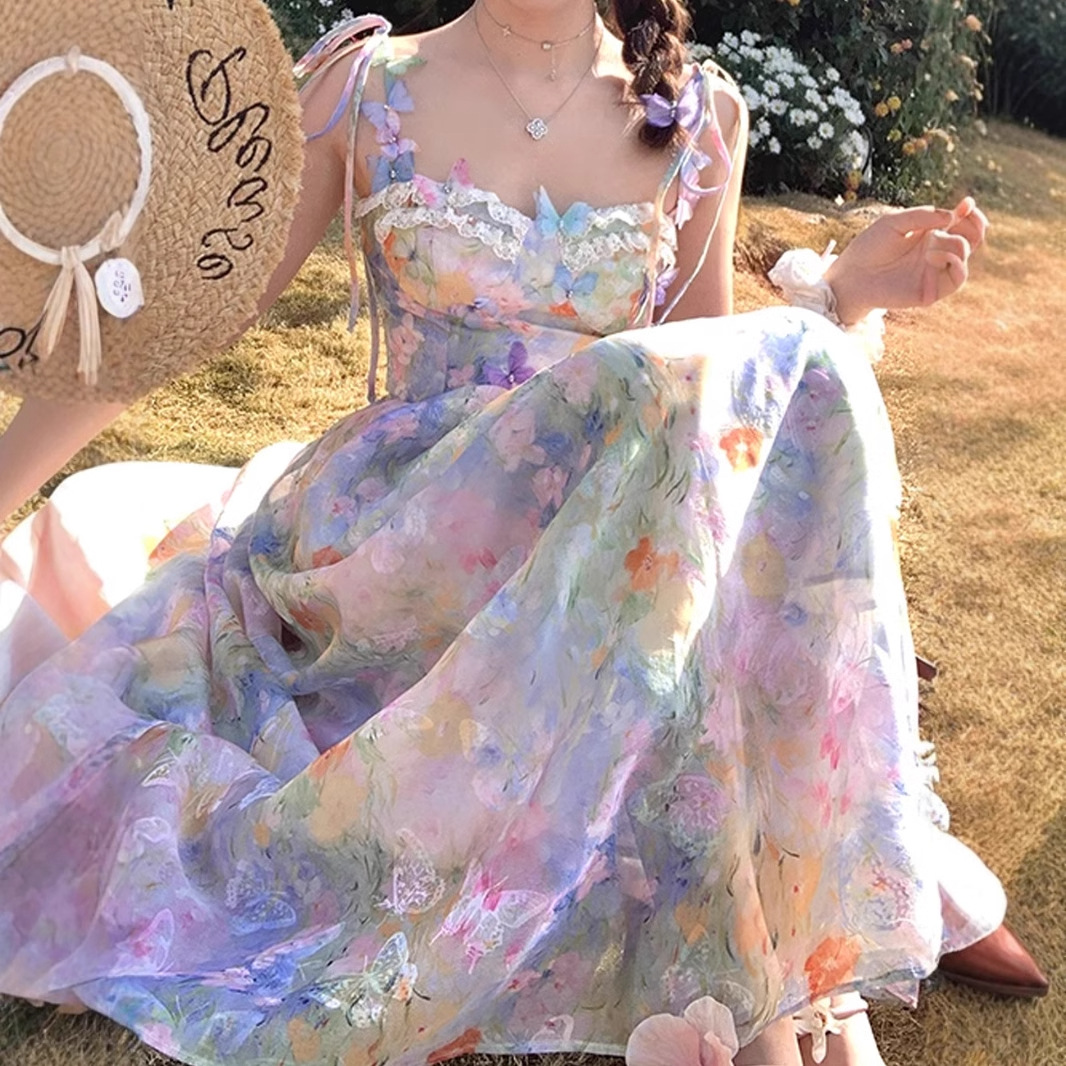 Gaun motif bunga model Eropa dan Amerika musim panas Xiaoqing tali wanita baru leher-u punggung terbuka gaun a-line ramping gaun motif bunga