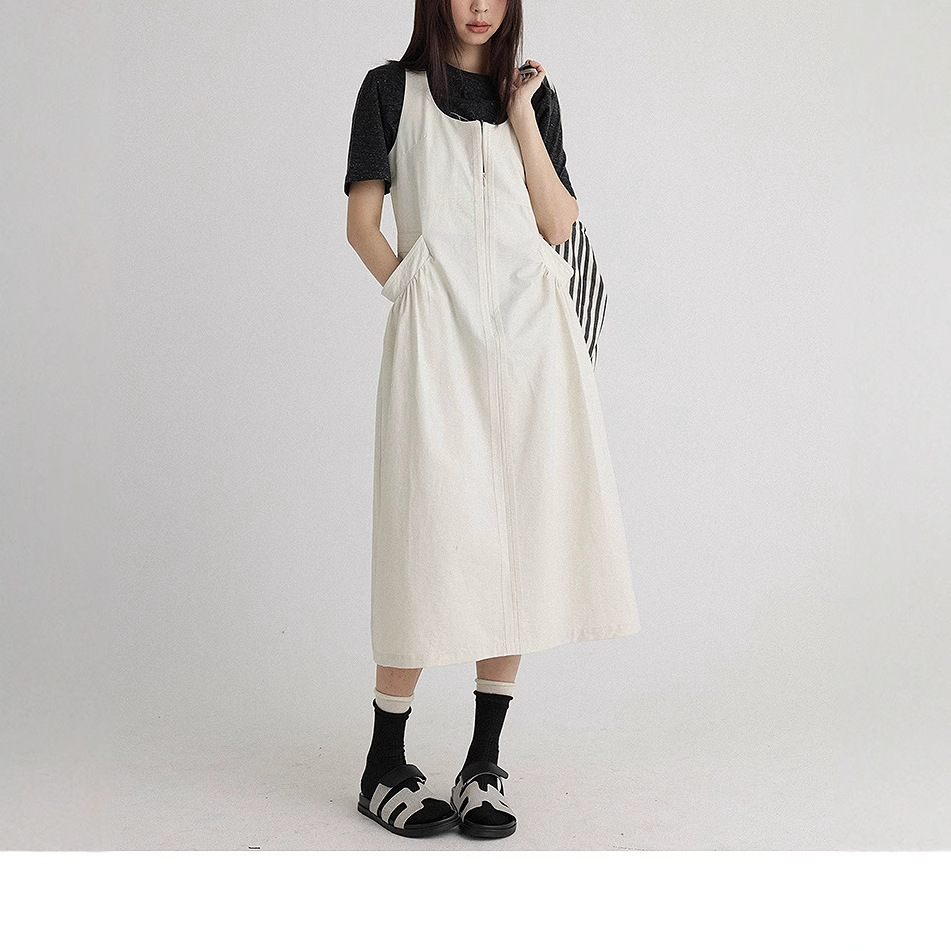 Gaun rompi wanita, gaya Korea Selatan chic leher bulat kontras warna jahitan longgar atas lutut ayunan panjang besar katun dan linen 9533