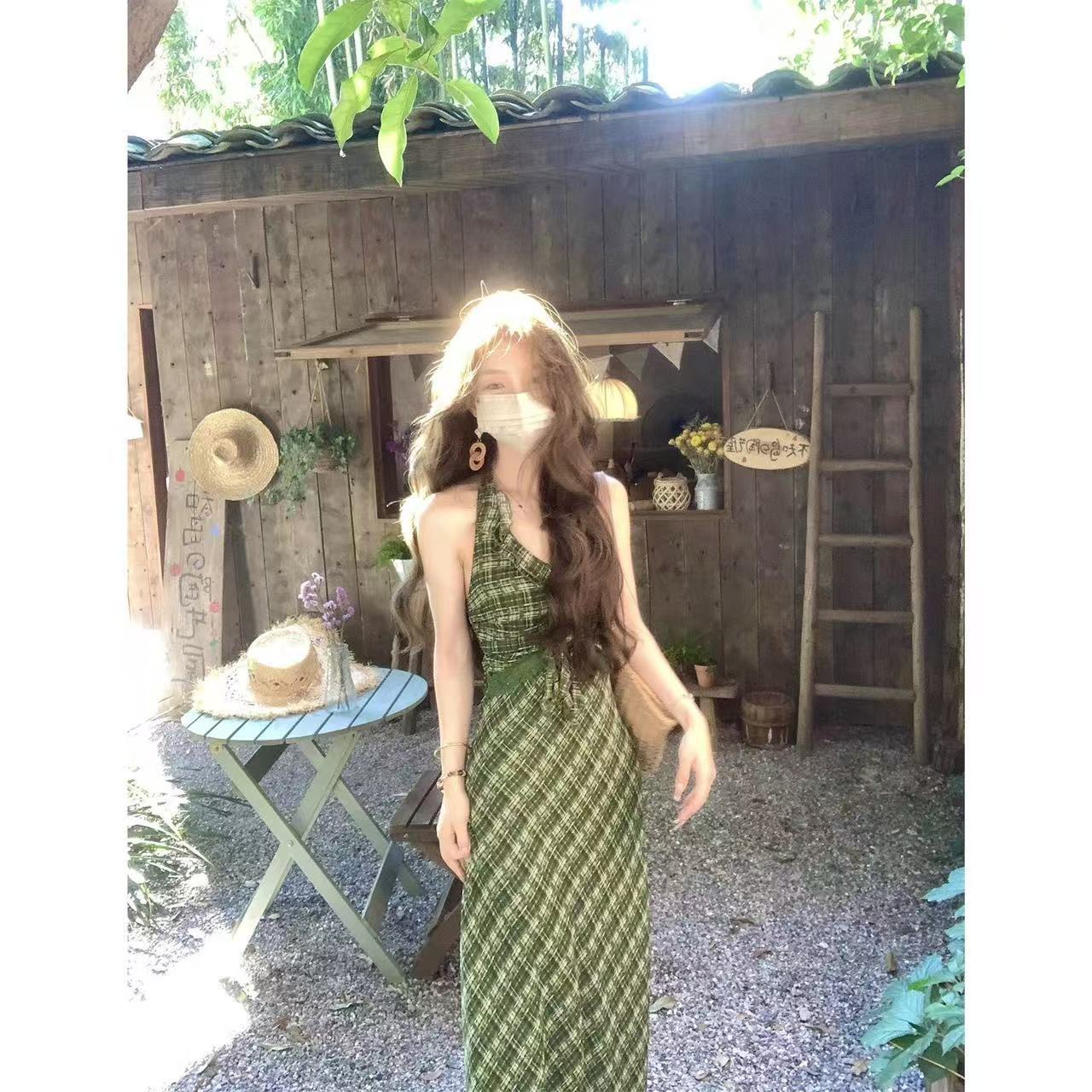 Gaun Suspender Pola Kotak Hijau Elegan Retro Wanita Model Baru 2025 Rok Panjang Punggung Terbuka Terlihat Langsing Pinggang Ketat Elegan Lembut
