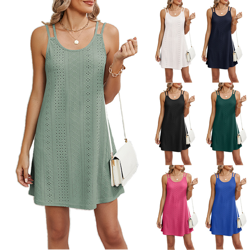 Cross-border rok suspender wanita, gaun rok A- line berongga modis Eropa dan Amerika musim panas 2023 seksi kerah U berkilau warna cocok