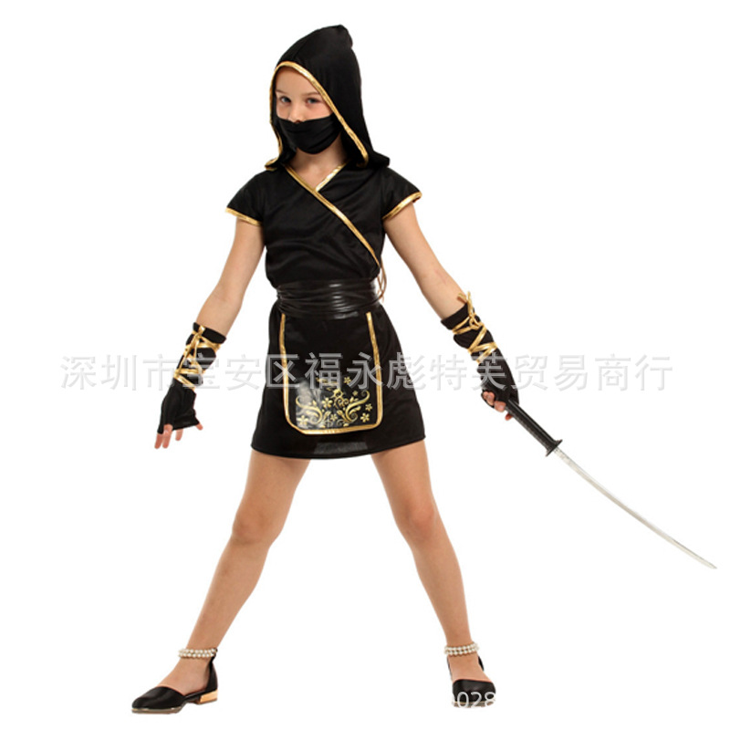 Kostum Halloween G-0372, kostum pertunjukan ninja anak perempuan, topeng cosplay ninja emas hitam