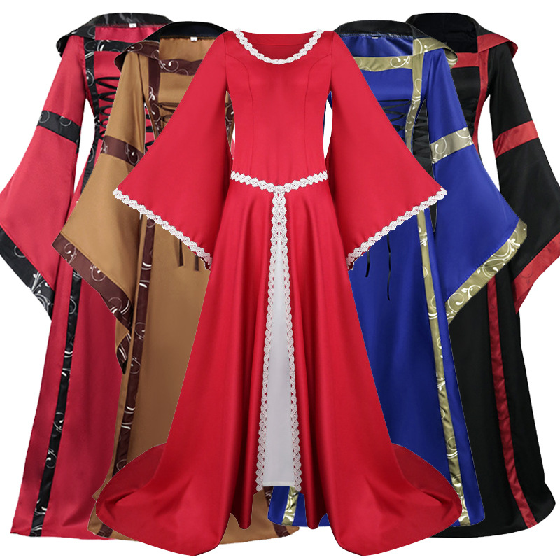 Abad Pertengahan retro perdagangan luar negeri Eropa dan Amerika gaun berkerudung kerah persegi renda lengan lonceng ayunan besar gaun kostum