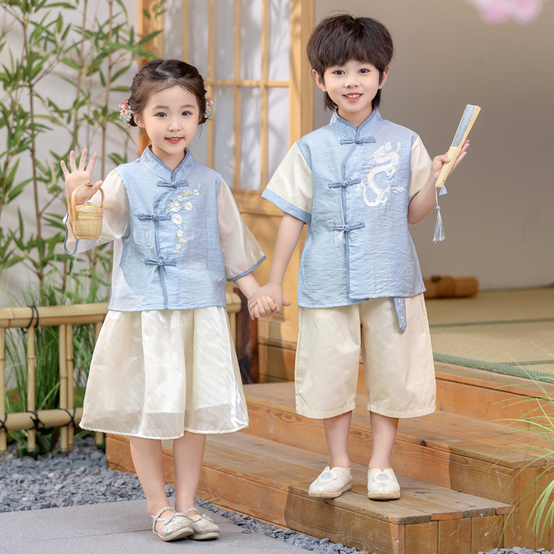 Hanfu pakaian bayi laki-laki dan perempuan, baju Tang gaya China taman kanak-kanak musim panas lengan pendek