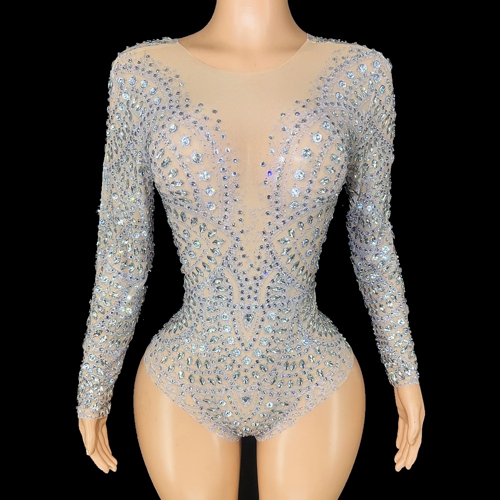 Jumpsuit berlian imitasi mengkilap lengan panjang seksi perdagangan luar negeri Eropa dan Amerika pakaian performa tari klub malam tembus pandang lintas batas