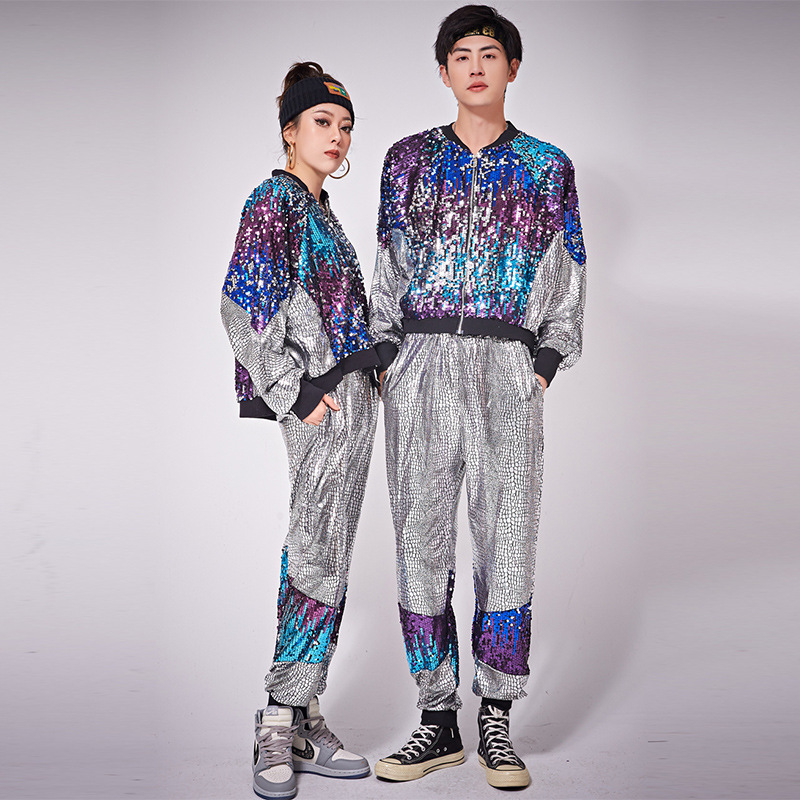 Pakaian penampilan hip hop, mantel kardigan berpayet, pakaian penampilan tari modern jazz longgar hip hop, hiphop, pakaian penampilan klub malam ds