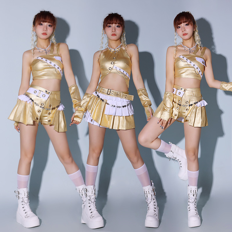 Pakaian Pertunjukan Cheerleader Emas Setelan Wanita Pakaian Tari Jalanan Hip Hop Seksi Pakaian Tari Jazz Pakaian Lagu Kelompok Wanita