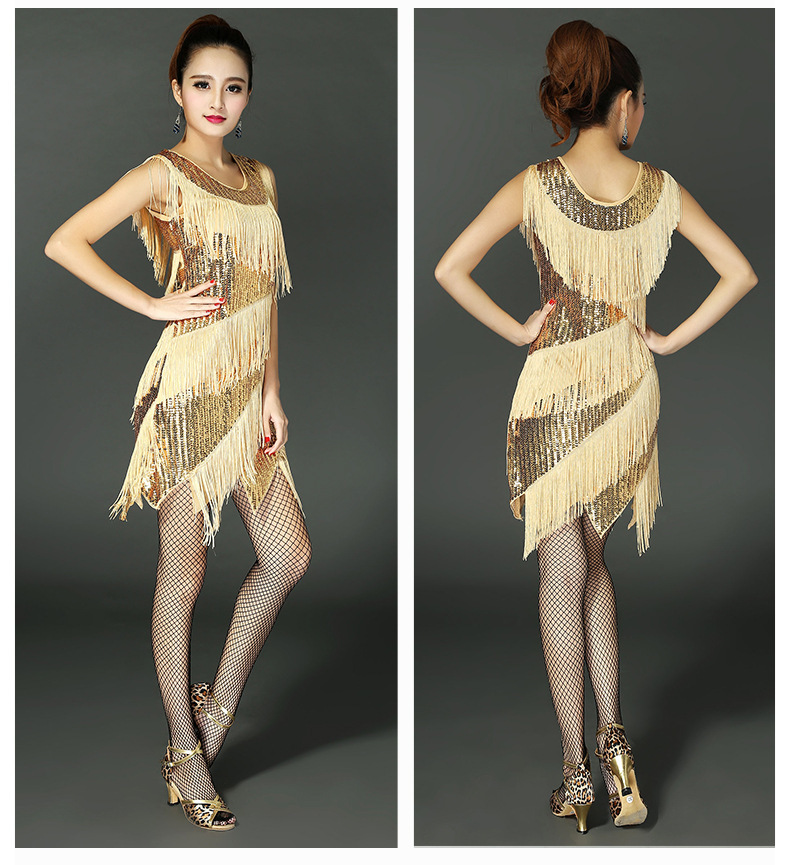 Pakaian dansa Latin dewasa pakaian pertunjukan rumbai berpayet ramping leher bulat ganda 2265