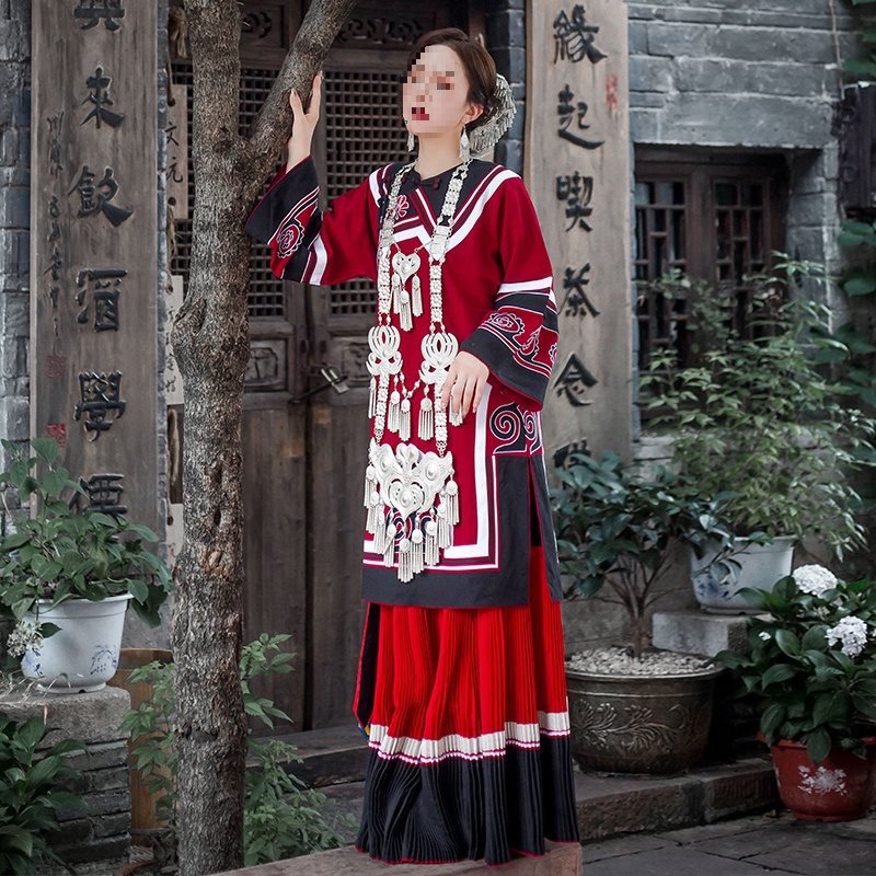 Pakaian Yi Pakaian Dewasa Minoritas Wanita Pakaian Katun dan Linen Pekerja Berat Bordir Gaya Etnis Pakaian Pertunjukan Fotografi