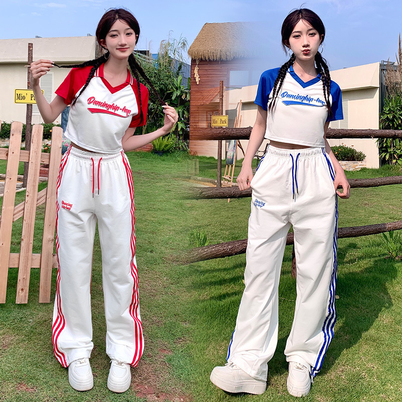 Tembakan nyata tarian jazz 2025 terlihat pusar terbuka pakaian pertunjukan longgar mengurangi usia pakaian senam tari hip-hop set tiga potong super keren
