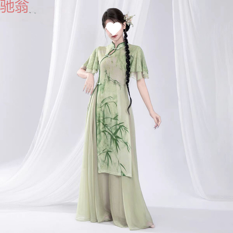 H8A Model Baru Tarian Klasik Gaya Nasional Cetakan Cheongsam Elastis Tarian Cina Pakaian Kasa Mengalit Set Pakaian Latihan