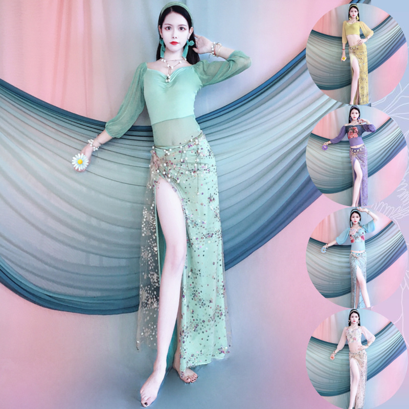 Pakaian dansa perut penari wanita, setelan baru musim gugur pakaian grup rok panjang pakaian latihan 5553