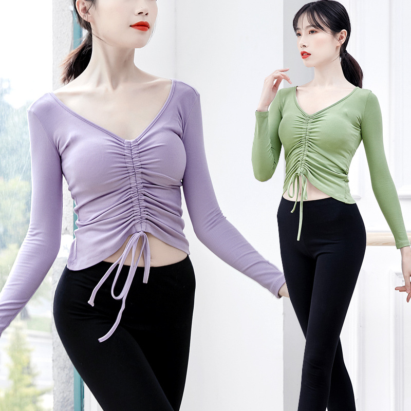 Kaus kebugaran lengan panjang, pakaian latihan dansa dewasa, kaus kebugaran lengan panjang, ramping, Atasan Wanita Klasik, bentuk yoga, tali serut