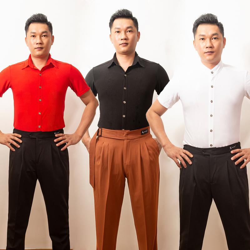 Baju dansa Latin pria, pakaian latihan tari modern lengan pendek atasan tari standar nasional persegi untuk menari