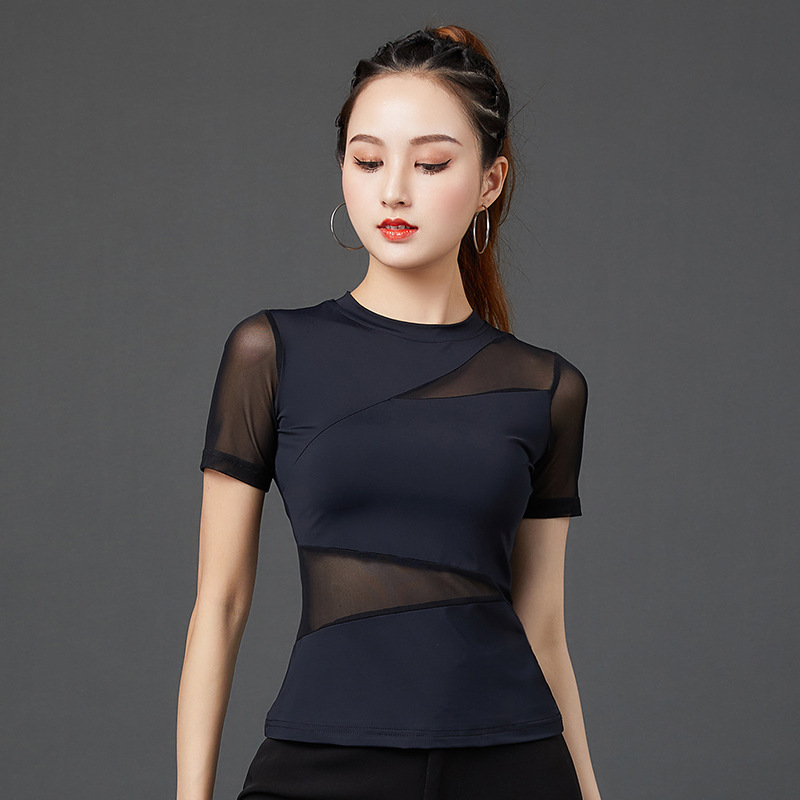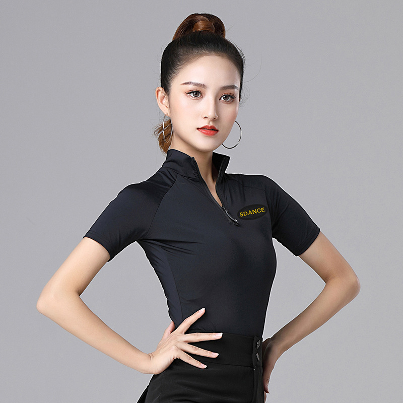 Baju dansa Modern, baju latihan tari Latin wanita musim panas lengan pendek ritsleting turtleneck pakaian dansa standar nasional wanita