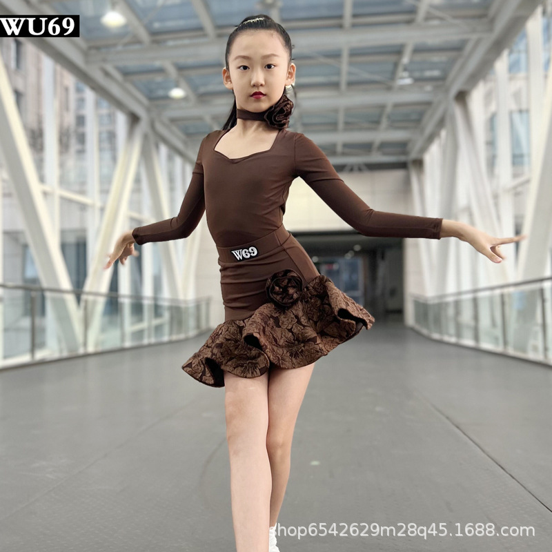 Pakaian dansa Latin anak-anak, pakaian latihan pertunjukan tari profesional, pakaian dansa Latin lengan panjang musim gugur untuk anak-anak