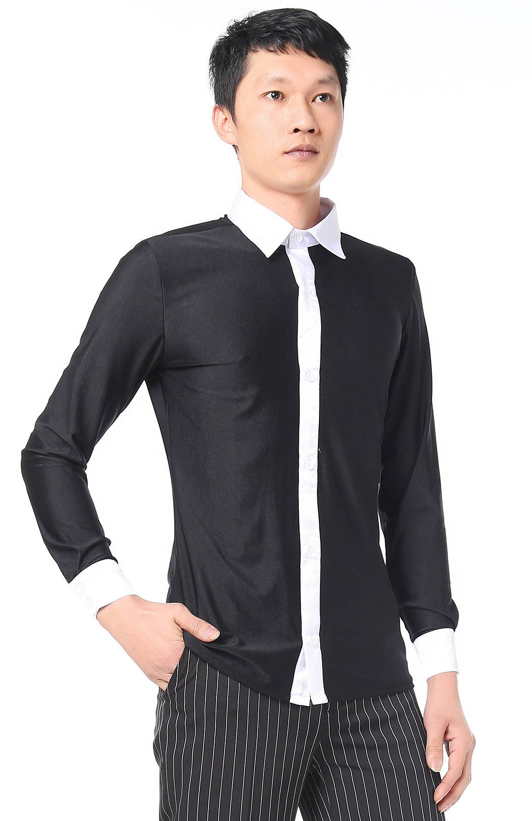 Baju dansa Latin untuk pria, baju dansa modern, pakaian latihan dansa persegi standar nasional, pakaian dansa warna hitam dan putih cocok dengan lengan panjang