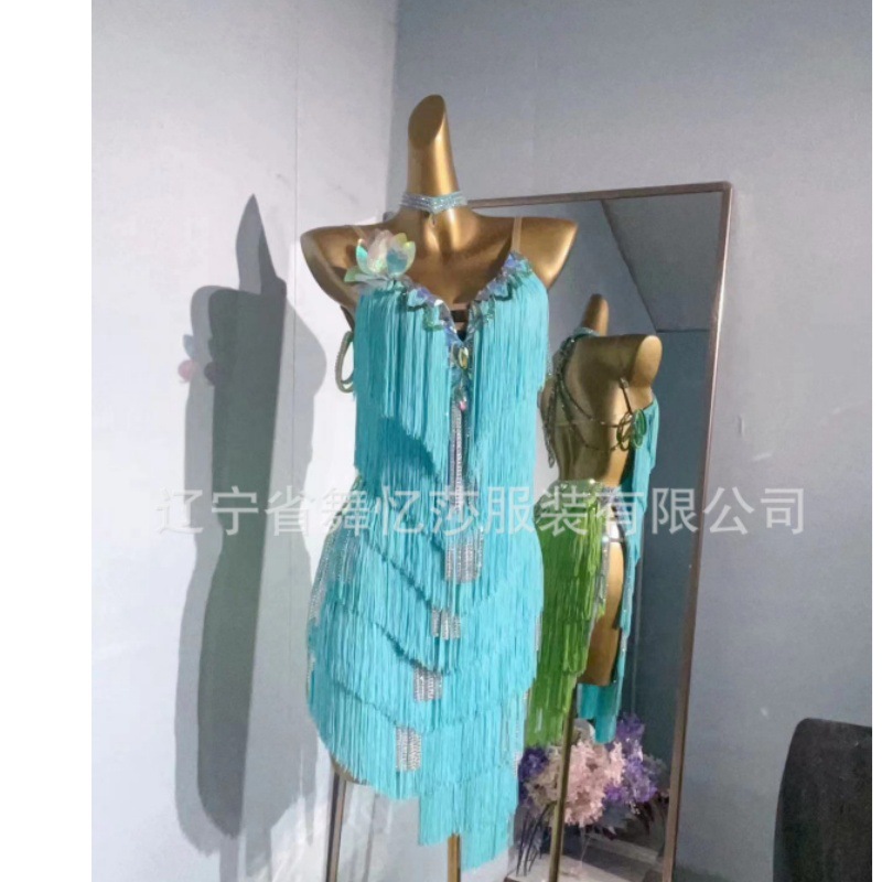 Gaun rumbai tari Latin, kostum profesional performa meja dansa, gaun rumbai Latin biru danau 2023