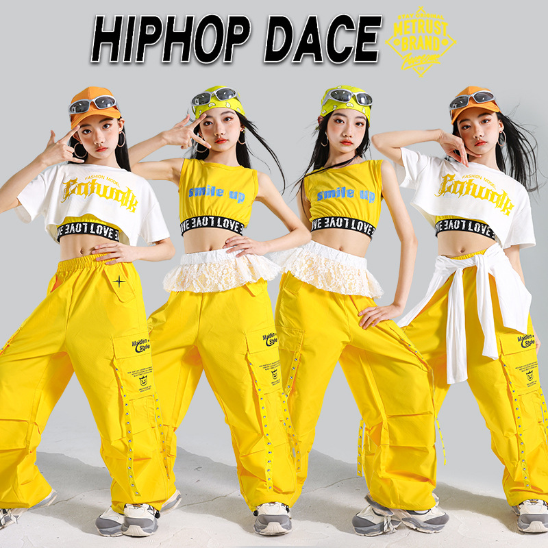 Pakaian Pertunjukan Jazz Jazz Anak Perempuan Pakaian Latihan Kuning Tank-top Pakaian Hip-hop Anak-anak Celana Anak Trendi