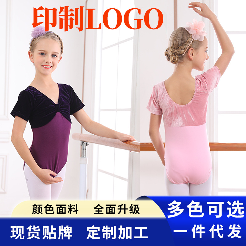Baju dansa Anak perempuan lengan pendek, pakaian dansa lengan pendek musim semi dan musim panas, pakaian balet ditingkatkan satu potong beludru emas