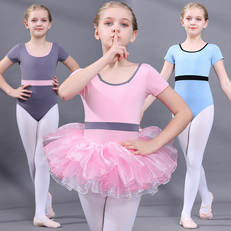 Grosir Pabrik baru pakaian latihan tari anak perempuan musim semi dan musim panas baju dansa Anak perempuan lengan pendek katun merah muda karet