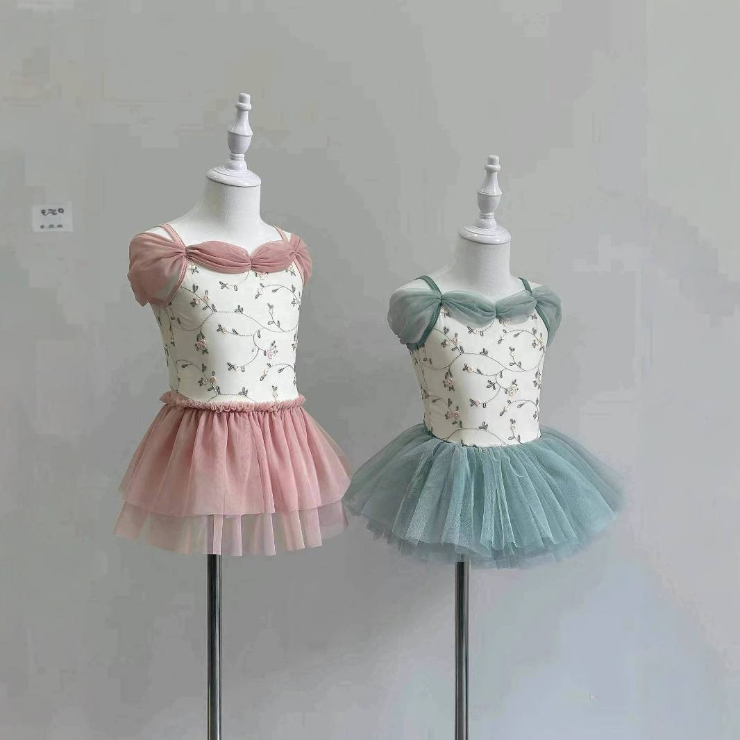 Pakaian Tari Musim Panas Anak-anak Pakaian Latihan Suspender Bordir Anak Perempuan Rok Balet Lengan Pendek Pakaian Tubuh Tes Tari Tiongkok
