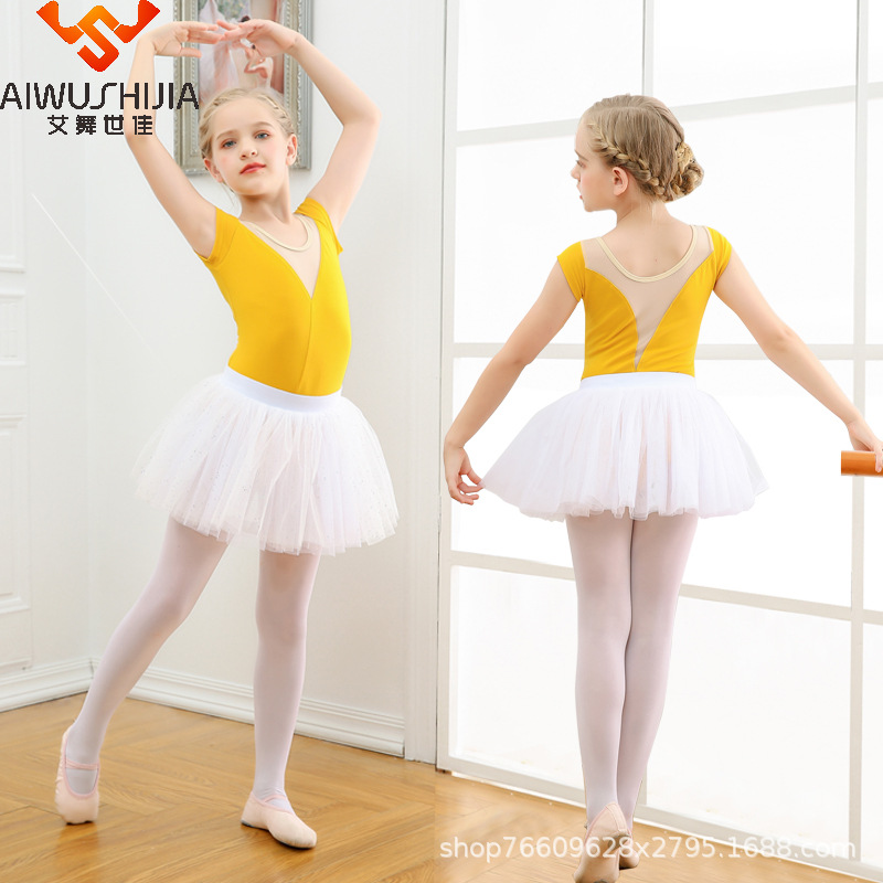 Pakaian latihan tari anak-anak gaun jala lengan panjang satu potong selangkangan terbuka tarian etnik Tiongkok grading putri tubuh lengan pendek panjang