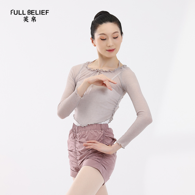 Fu Yi pakaian dansa balet wanita lengan panjang, mantel rajut dewasa, pakaian latihan renda, atasan blus luar