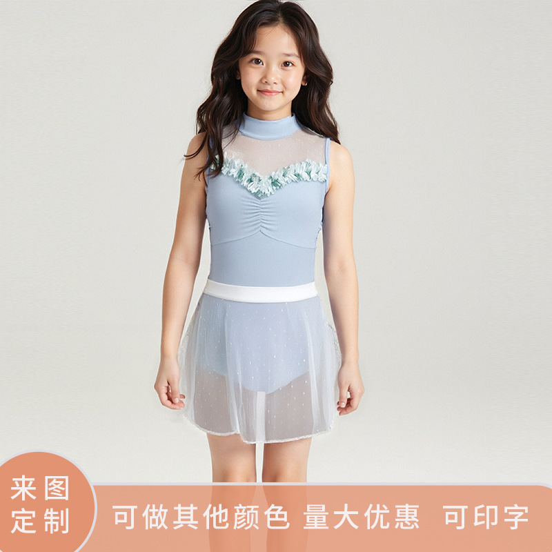 Pakaian Tari Anak-anak Pakaian Latihan Jaring Kerah Tinggi Tanpa Lengan Biru Musim Panas Anak Perempuan Pakaian Senam Balet Tari Tiongkok