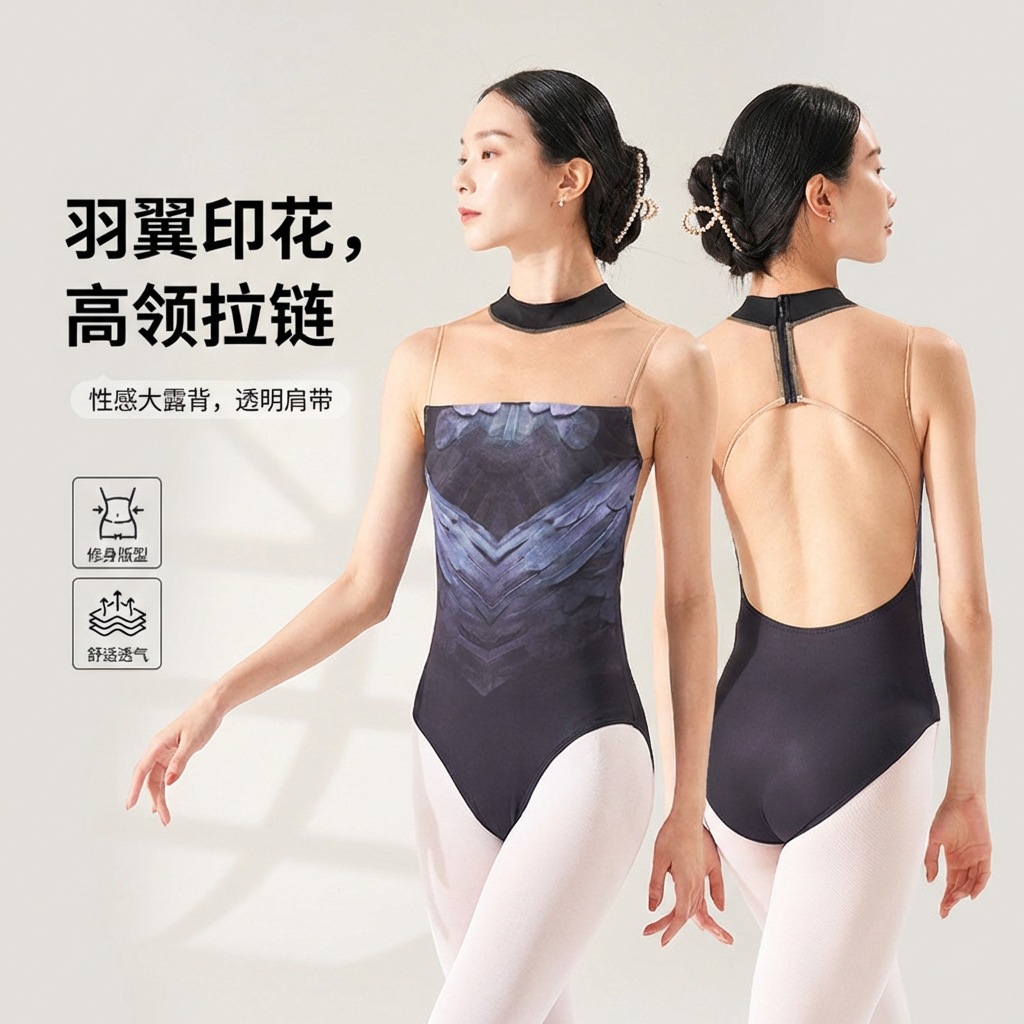 Kostum tari modern 2025 untuk wanita, leotard senam hitam tanpa punggung untuk ujian seni, model one-piece belahan tinggi.