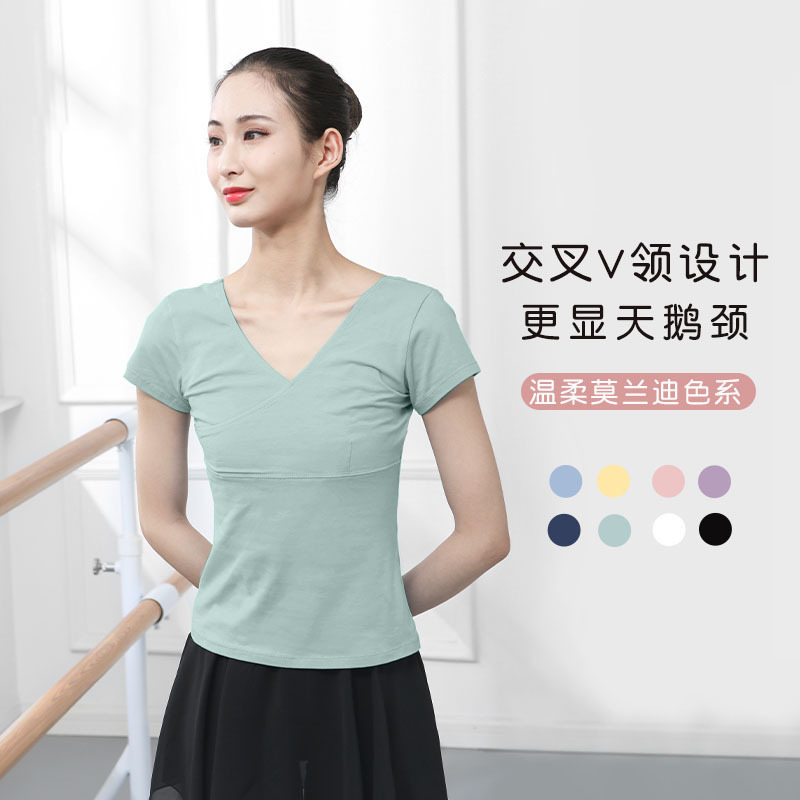 Pakaian Tari Baju Atasan Lengan Pendek Pakaian Latihan Kerah V Pakaian Tubuh Wanita Tari Dewasa Cina Warna Hitam Terlihat Langsing Tes Seni Menari Musim Panas